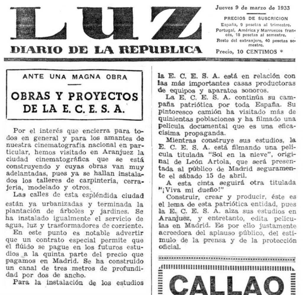 ECESA intentó comenzar la actividad los estudios con la película Invasión, de Fernando Mignoni (nunca se llegó a estrenar) y Sol en la Nieve (de León Artola con la colaboración de Antonio Valero de Bernabé.) que tras una larga espera se estrenó el 23 de abril de 1934 en el cine-teatro Monumental de Madrid ubicado en el nº 87 de la calle Atocha. Aunque a todos los efectos y tras un rápido rodaje, la comedia El novio de mamá queda como la primera película realizada en Aranjuez. Se estrena en el cine Avenida de Madrid el12 de abril de 1934 y tuvo como protagonistas a Imperio Argentina y Miguel Ligero, el tándem de mayor éxito en el cine de la II República. La película estaba dirigida por Florián Rey y participaba también Carmen Ruiz Moragas.
