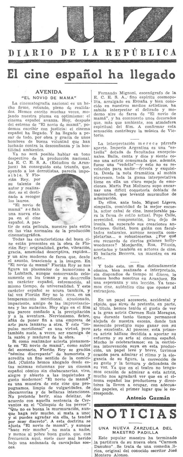 La cinematografía nacional es un hecho firme, rotundo, pleno de realidades. Hemos escrito muchas veces, mojando nuestra pluma en optimismo: el cinema español avanza. Hoy, después del estreno de ‘El novio de mamá’, podemos escribir con justicia: el cinema español ha llegado. Y ha llegado a pesar de todo, por obra y gracia de unos hombres de buena voluntad que han luchado contra la desconfianza y la hostilidad ambientes. Ya no será posible hablar en tono despectivo de la producción nacional. La ECESA (Estudios de Aranjuez) ha conseguido este triunfo, que, oyendo a los derrotistas, parecía imposible…