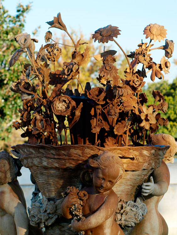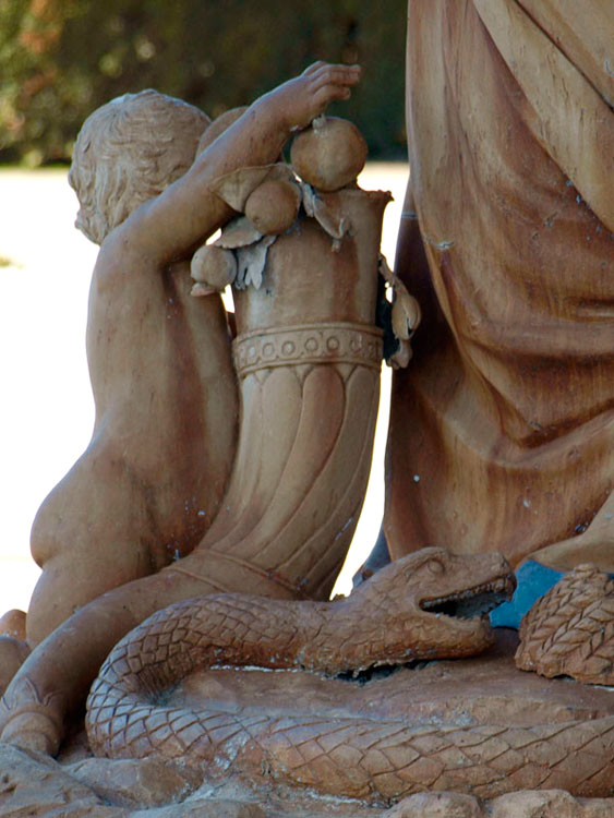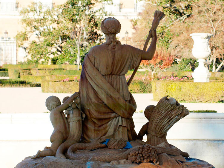 Nuestra Ceres ribereña está sentada, no tiene grandes pechos y solo posee un cuerno de la abundancia. Pero la riqueza de la huerta de Aranjuez hace que sean ocho los niños que la acompañan portando los frutos de la tierra. De los dos más cercanos uno sostiene el cuerno, del que brotan frutas entre las que destacan unas granadas. Quizá simbolizando las semillas de este fruto que su hija comió en el reino de las sombras.
